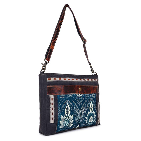 Canvas & Leather Shoulder Bag - Indigo Print
