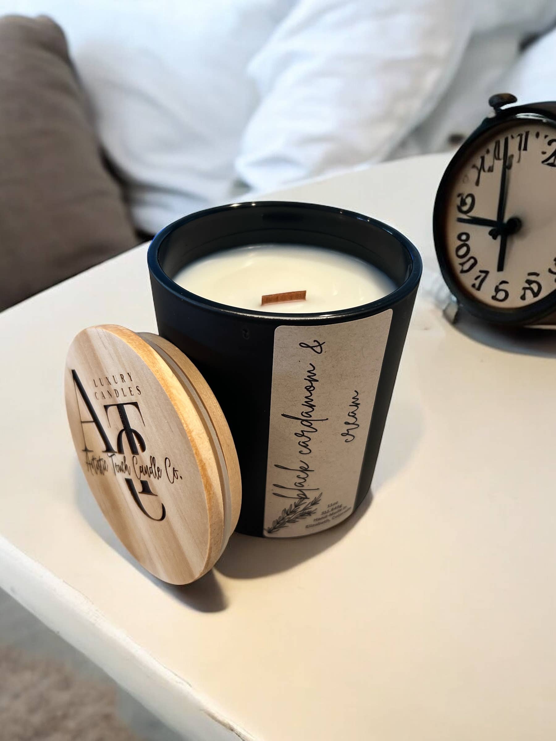 Top notes: Cinnamon, Peppercorn. Middle notes: Cream, Black Cardamom, Ginger. Base notes: Tonka Bean, Chestnut, Wood. Our candles are handmade in small batches with a custom soy wax blend with a crackling cedar wood wick. Our candles are made with phthalate free fragrance oils for a clean burn. Approx burn time is 60-80 hours.