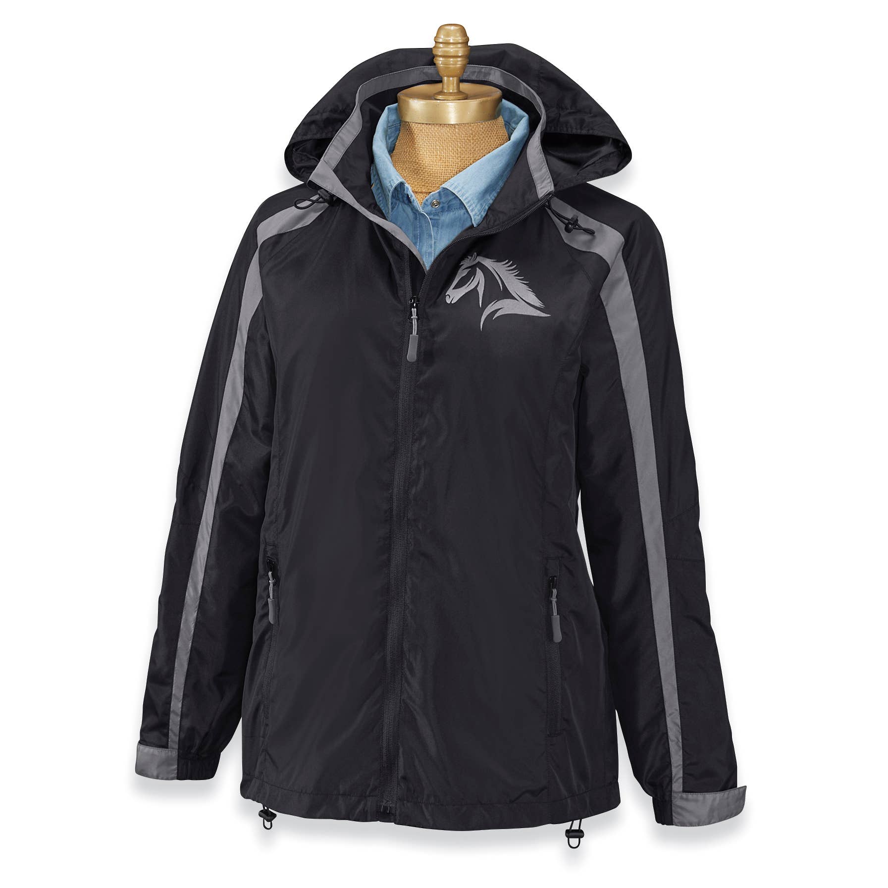 A windblown horse print and rider-friendly styling make our water-resistant, windproof jacket a standout. Princess seaming for fit. Drawstring hood folds into collar. Articulated sleeves, secure zip pockets, hidden patch pocket and drawcord hem. Front zip has chin guard. Elastic cuffs have adjustable, hook-and-loop tabs. Fully lined. 28" long in size medium. 100% poly; poly lining. Machine washable.