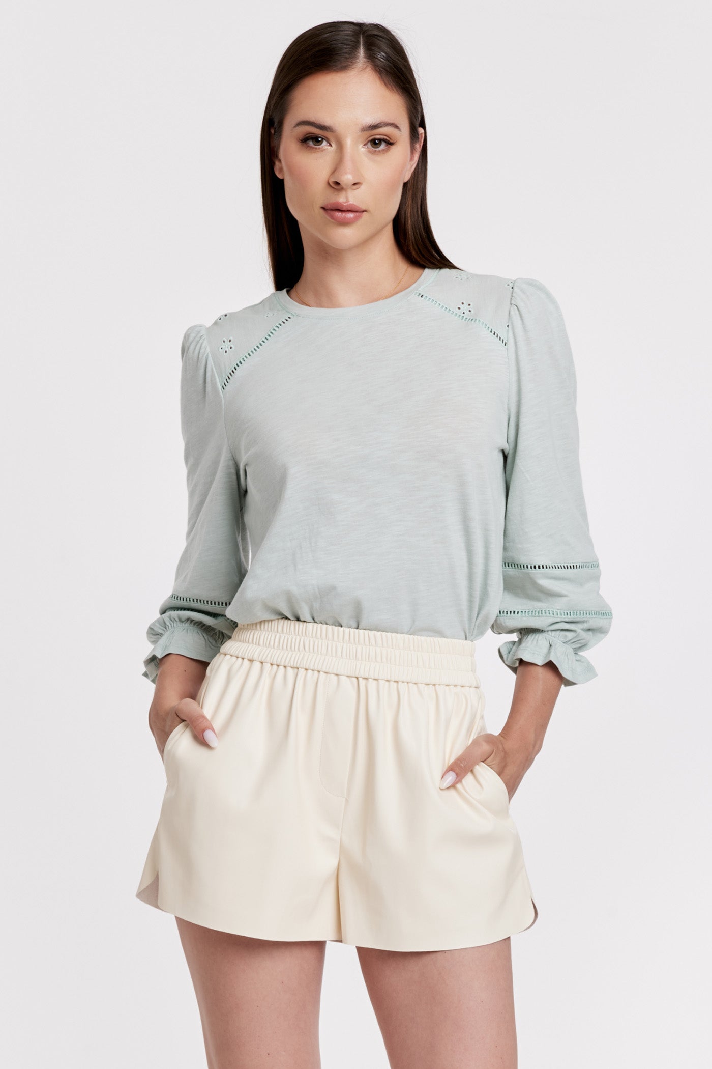 3/4 SLEEVE EYELET CONTRAST TOP BODY+SLEEVES: 60% COTTON, 40% RAYON YOKE: 100% COTTON