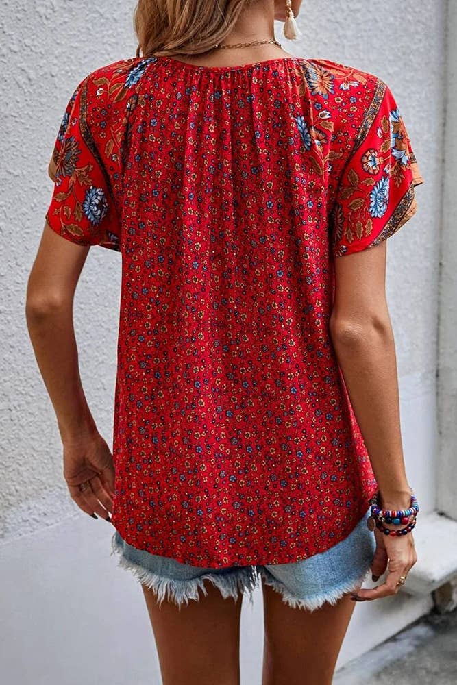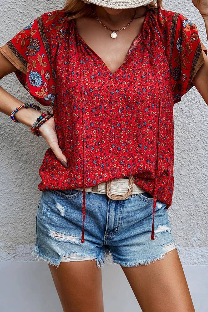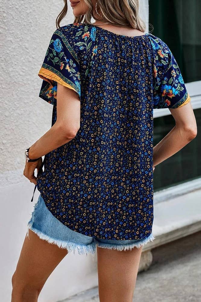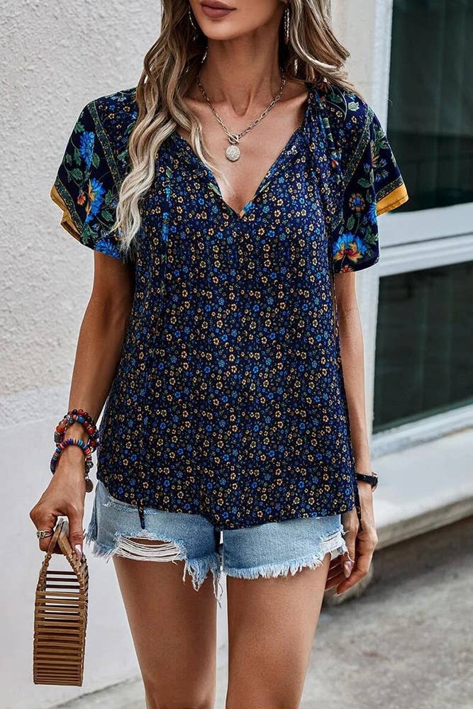 Floral Print V Neck Short Flare Sleeves Shirt