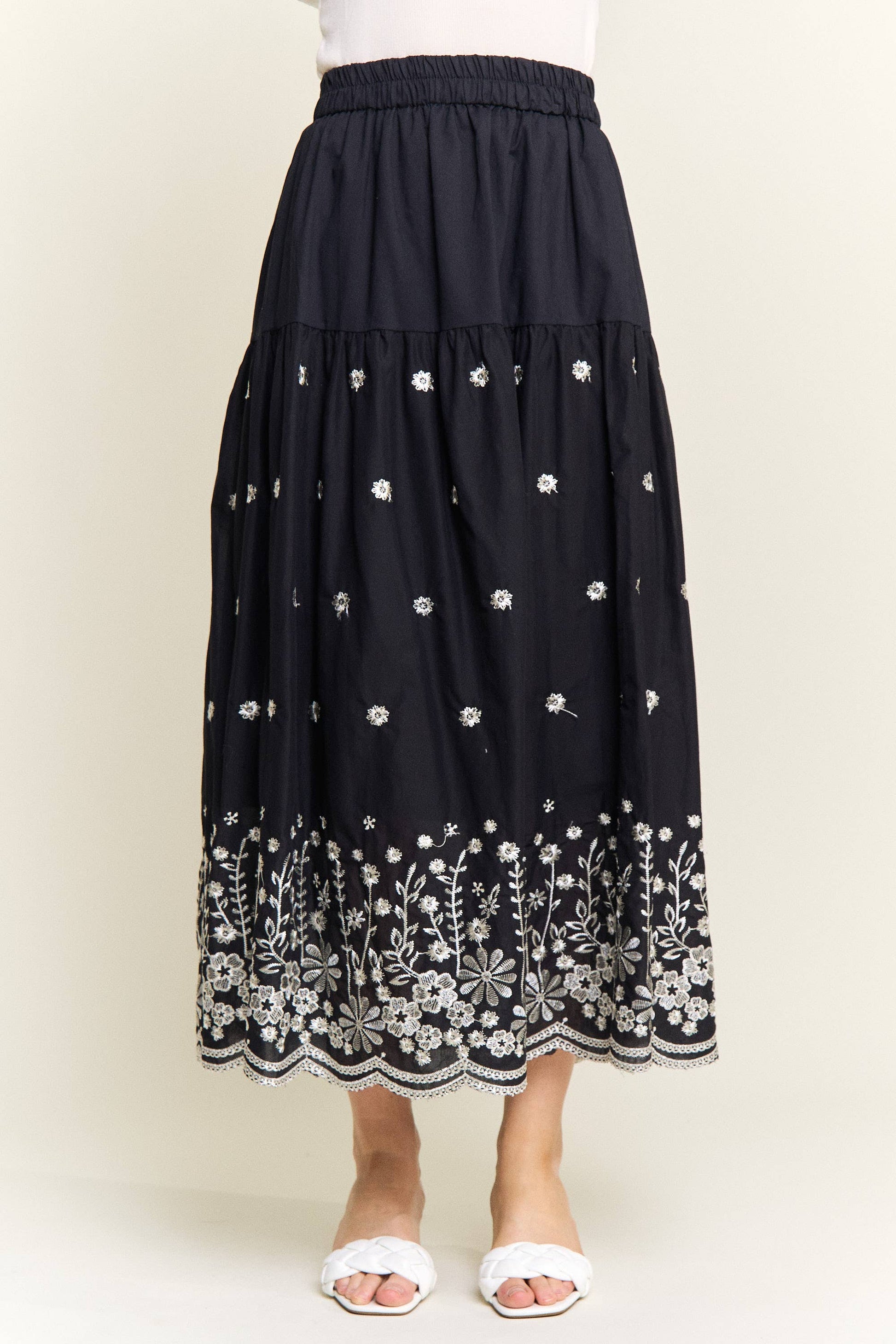 This skirt features a tiered silhouette, crafted from 100% cotton for the main fabric, ensuring breathability and comfort. The design is enhanced with delicate embroidery scattered across the tiers. The hemline boasts a more intricate floral embroidery pattern, adding a touch of artisanal charm and visual interest. The waistband is elasticized, providing a flexible and comfortable fit. offering a lightweight feel. 100% COTTON, CONTRAST: 65% POLYESTER 35% COTTON *Floral Embroidery *Tiered design *Scalloped hemline *Elastic waistband Actual product color may vary from the images shown.