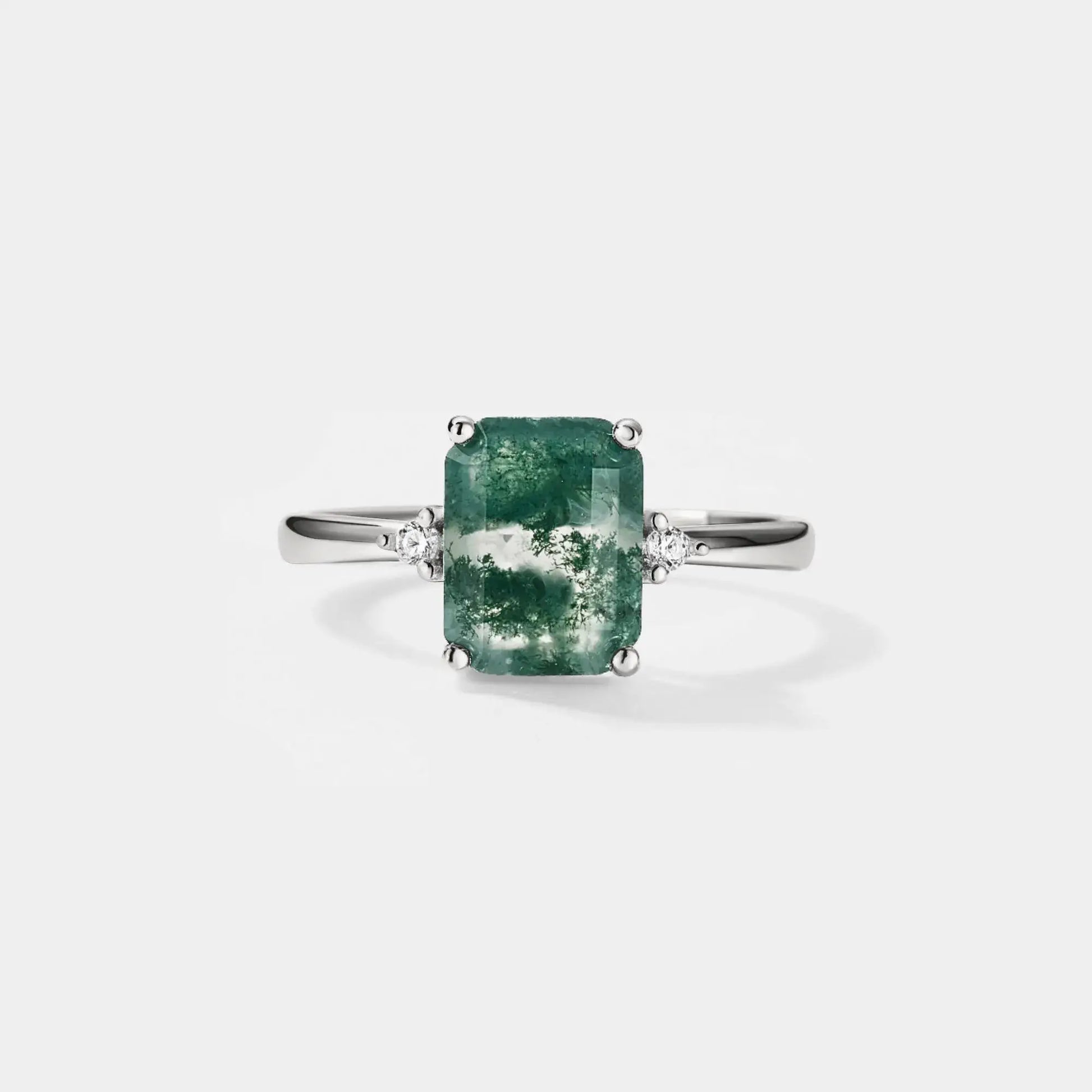 Emerald Cut Moss Agate Solitaire Ring in 925 Sterling Silver