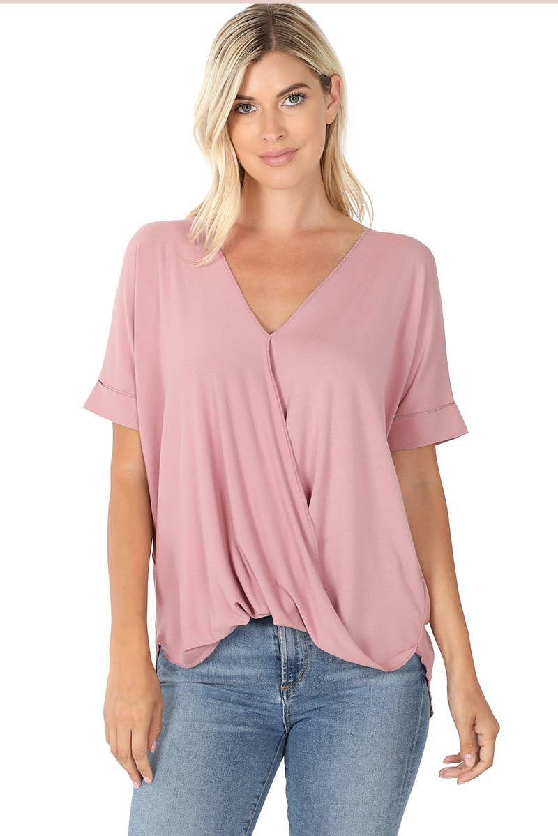 A layered, draped-front look on this V-neck top lends trend-right appeal to your outfit of the day. Size S: 23.5'' long from high point of shoulder to hem Model (wearing size S): 5' 10'' tall; 34'' chest; 24'' waist; 34'' hips 95% rayon / 5% spandex Machine wash.