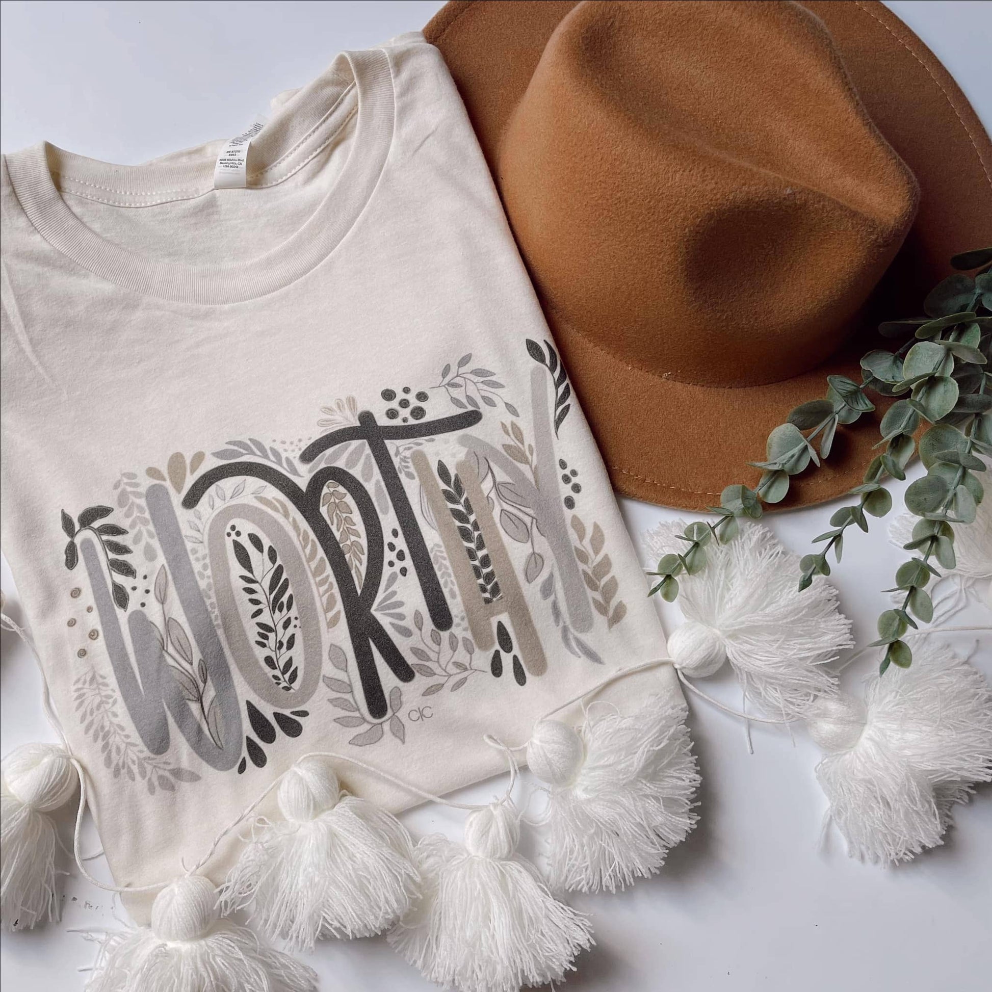 -DTG on BELLA CANVAS -Unisex -True to size -hand drawn, one of a kind graphic ft our floral word "worthy" graphic